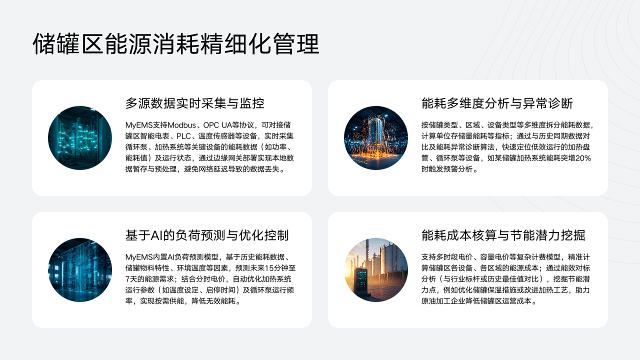 前面我们了解了MyEMS系统在能耗统计分析、设备监测、碳管理等多方面的功能。现在,我们将目光聚焦到石油化工行业应用场景。本页将开启对具体应用方案的介绍,后续会详细阐述炼油装置能耗监控、储罐区管理等方案,让我们一同深入探究。