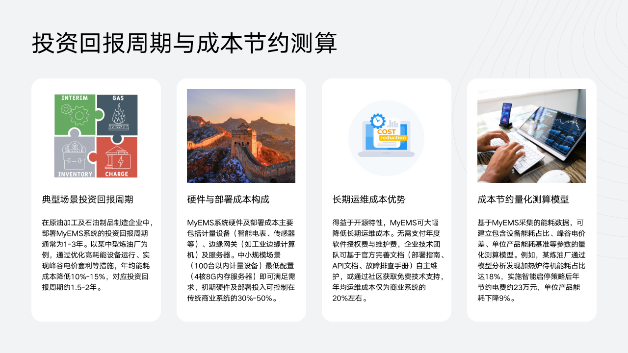 部署MyEMS系统在原油加工及石油制品制造企业中具有显著的投资回报优势。通常情况下,该系统的投资回报周期为1 - 3年。以某中型炼油厂为例,通过优化高耗能设备运行以及实现峰谷电价套利等有效措施,年均能耗成本能够降低10% - 15%,对应的投资回报周期约为1.5 - 2年,这充分体现了系统在成本节约方面的高效性。