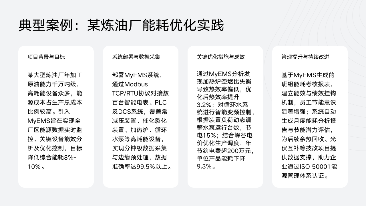 前面我们详细了解了石油化工行业不同场景下MyEMS系统的应用方案。接下来进入"实施效益与案例分析"环节,此部分能让我们直观看到MyEMS系统在实际应用中带来的节能成效、成本节约等效益。之后还会有典型案例展示,值得期待。