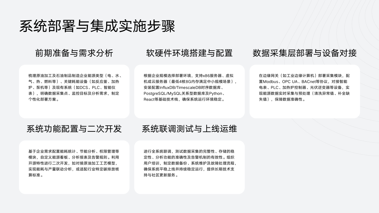 之后进行系统功能配置与二次开发,基于企业需求配置能耗统计、节能分析、权限管理等模块,自定义能源看板、分析报表及告警规则。利用开源特性进行二次开发,如对接原油加工工艺模型,实现能耗与产量联动分析,或适配行业特定碳排放核算标准。