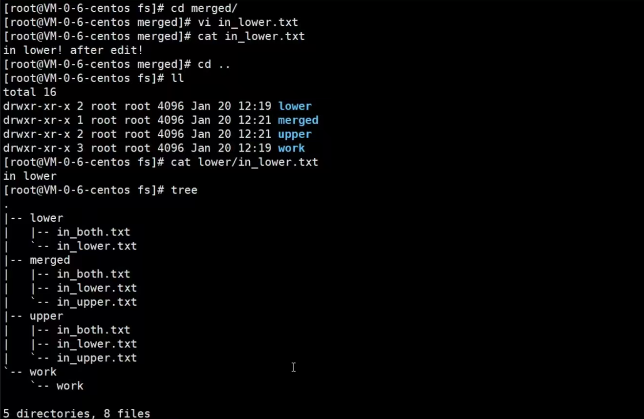编辑,merge 目录下编辑一下 in_lower.txt, upper 目录下就会马上出现一个 in_lower.txt,而且内容就是编辑后的。而 lower 目录下的 in_lower.txt 内容不变