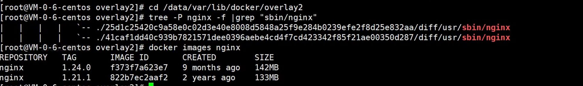 我们可以看到 lowerdir, upperdir,都位于/data/var/lib/docker/overlay2 下面,因为我们调整过默认存储位置所以对比默认的/var/lib/docker 多了/data,我们在这个目录下查找我们的 nginx,看下文件是如何被存储的。搜索后可以看到我们找到了多个nginx 文件,因为我们本地有多个 nginx 镜像所以搜到了多个 nginx 文件,通过lowerdir 的值我们可以确定有一个是和我们 nginx:1.12.1 的匹配上的,红色部分。