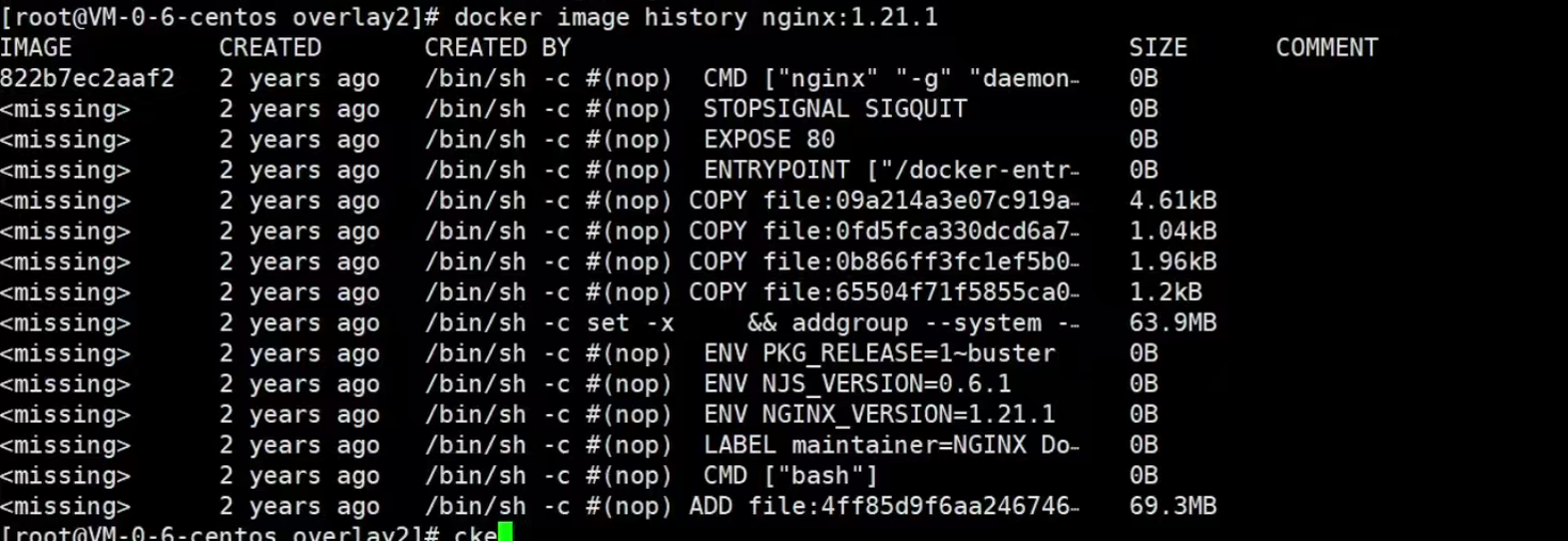 通过 docker image history 查看如下,我们可以看到 dockerfile 和做出来的镜像是对