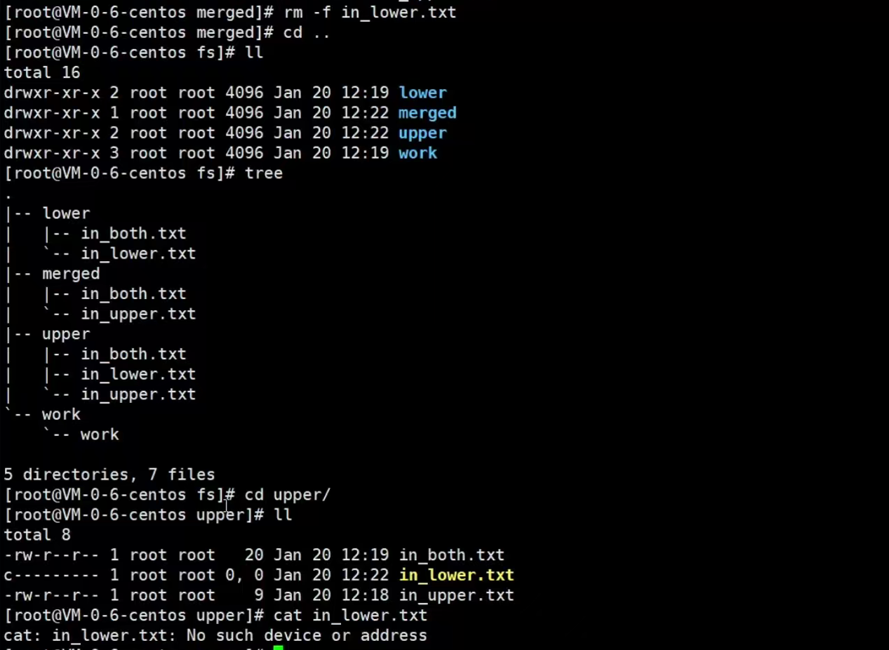 upper/ 目录中增加了一个特殊文件来告诉 OverlayFS, "in_lower.txt'这个文件不能出现