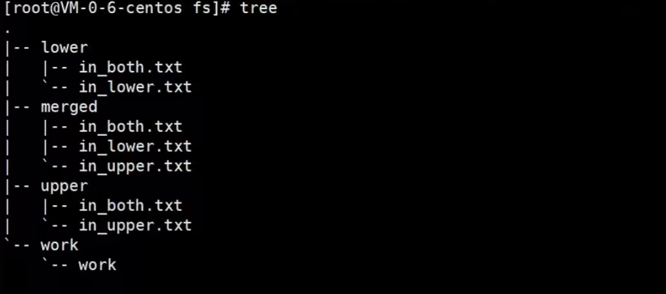 我们此时看下目录结构,然后发现 merged 目录自动生成了 3 个文件,可以看到boteh,lower,upper 都在。 merged 目录其实就是用户看到的目录,用户的实际文件操作在这里进行。