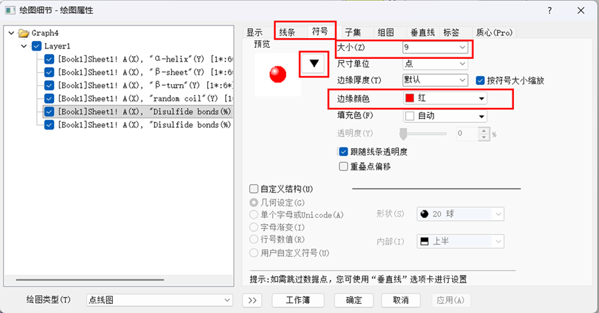 9.美化点线图,在符号和线条对话框下,将其颜色和大小修改成自己喜欢的颜色和大小;