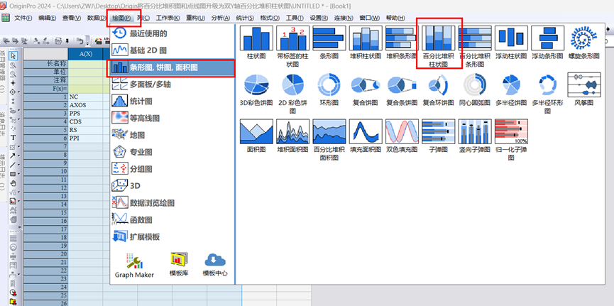 2.选中百分比堆积柱状图数据,点击绘图---条形图,饼图,面积图---点击百分比堆积柱状图;
