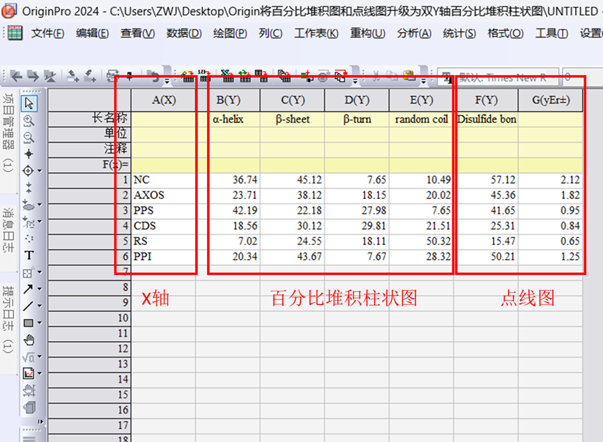 1.打开Origin软件,将数据导入到软件中,数据格式为XYY,其中包括百分比堆积柱状图数据和点线图数据,如下图所示:
