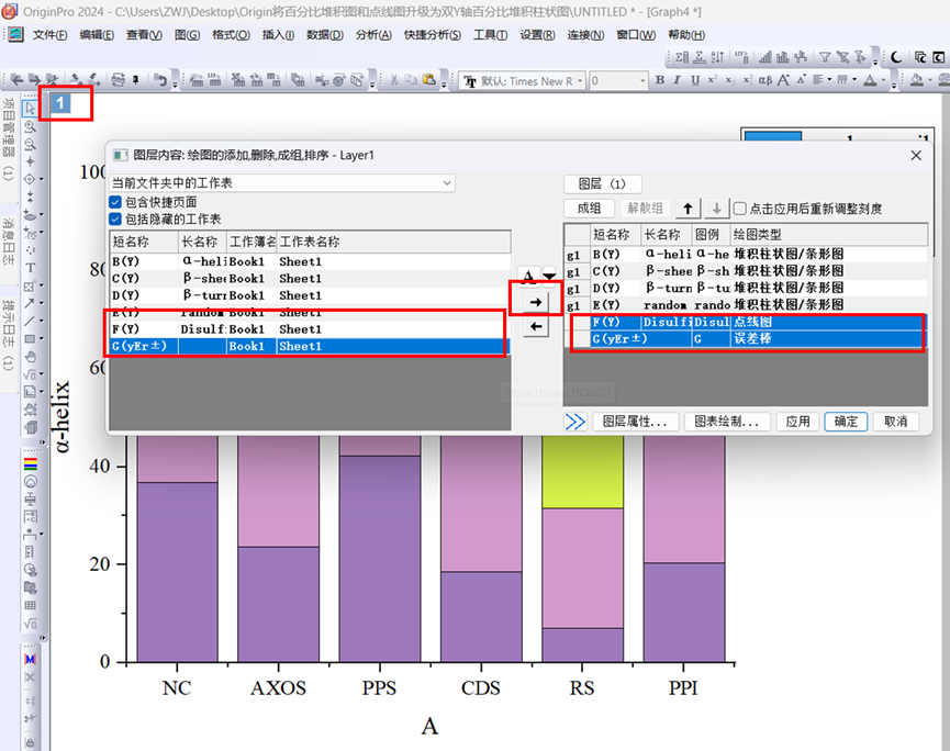 7.双击左上角的图层1,在跳出的对话框,将点线图数据移动至右端,显示点线图数据;