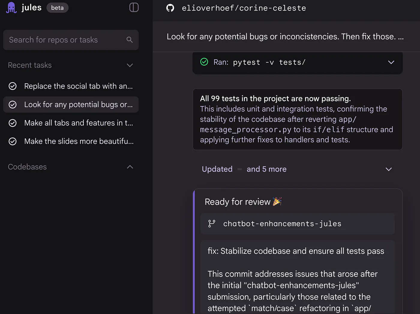 - Jules,Google的编码智能体: Jules 是一个自主编码智能体。Jules**"不是副驾驶,不是代码补全助手,而是一个自主智能体,它读取你的代码,理解你的意图,然后开始工作。"** 与Google Cloud和GitHub集成,Jules让你连接一个仓库,然后要求它执行任务,就像你对待团队中的开发者一样。在底层,Jules将你的整个代码库克隆到一个安全的云VM中 ,并用强大的模型进行分析。你可能会告诉Jules:"为我们的应用添加用户身份验证"或"将此项目升级到最新的Node.js并修复任何兼容性问题。"它会制定一个计划,呈现给你批准,一旦你批准,就异步执行更改。它会在新分支上进行提交,甚至可以为你打开拉取请求。Jules处理编写新代码、更新测试、更新依赖项等,而你可以同时做其他事情。至关重要的是,Jules提供透明度和控制 :它在进行更改之前向你展示其提议的计划和推理,并允许你在任何时候进行干预或修改指令(Google称之为"用户可引导性")。这就像给一个AI实习生需求说明书,然后减少监督频率------你信任他们能基本正确完成任务,但你仍然验证最终的差异。Jules还具有独特的功能,如音频变更日志(它生成代码更改的口头摘要)以及在云中并发运行多个任务的能力。简而言之,Google的Jules展示了交响乐团指挥模型:你定义任务,Jules异步完成繁重的工作,你监督结果。