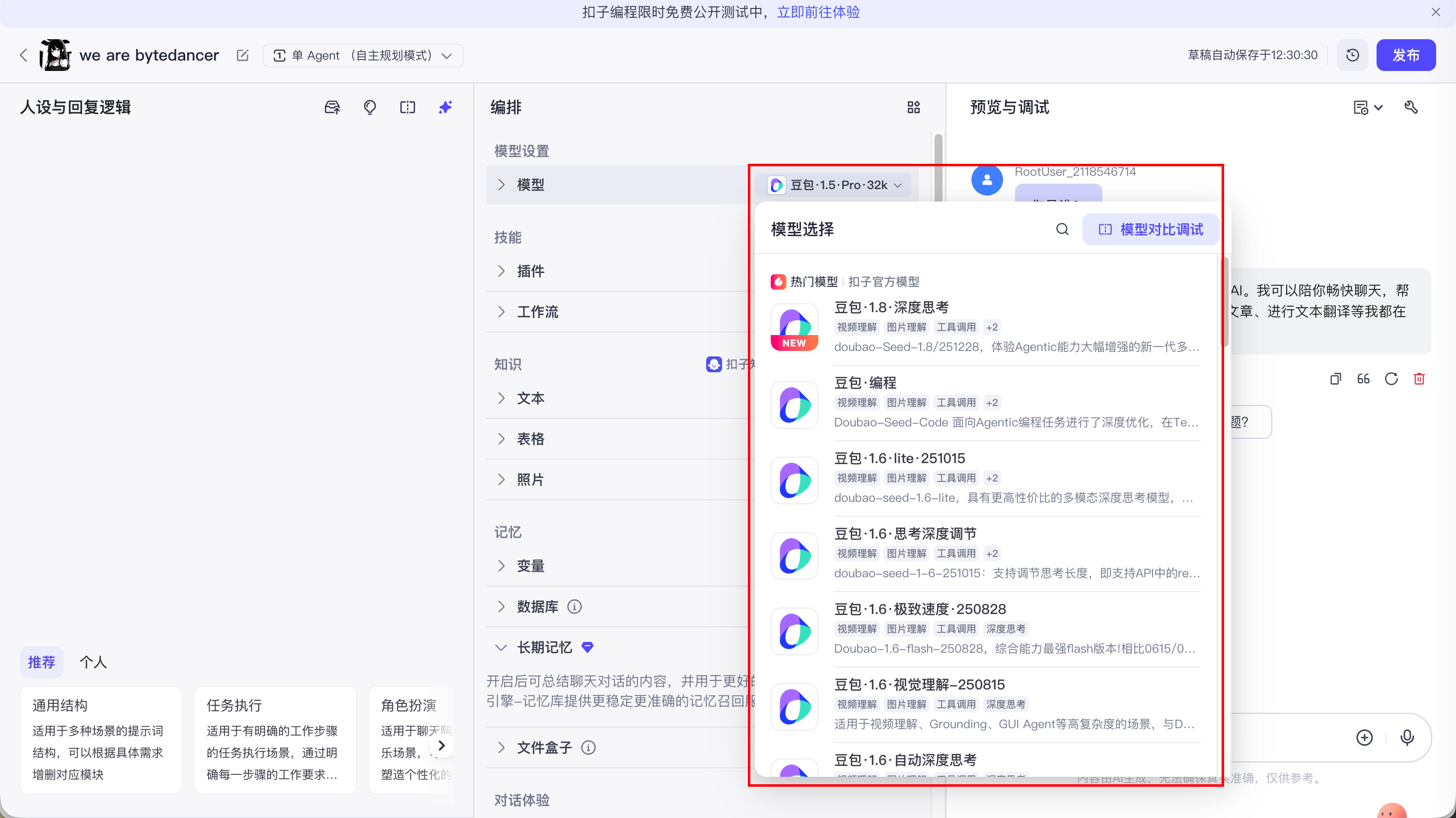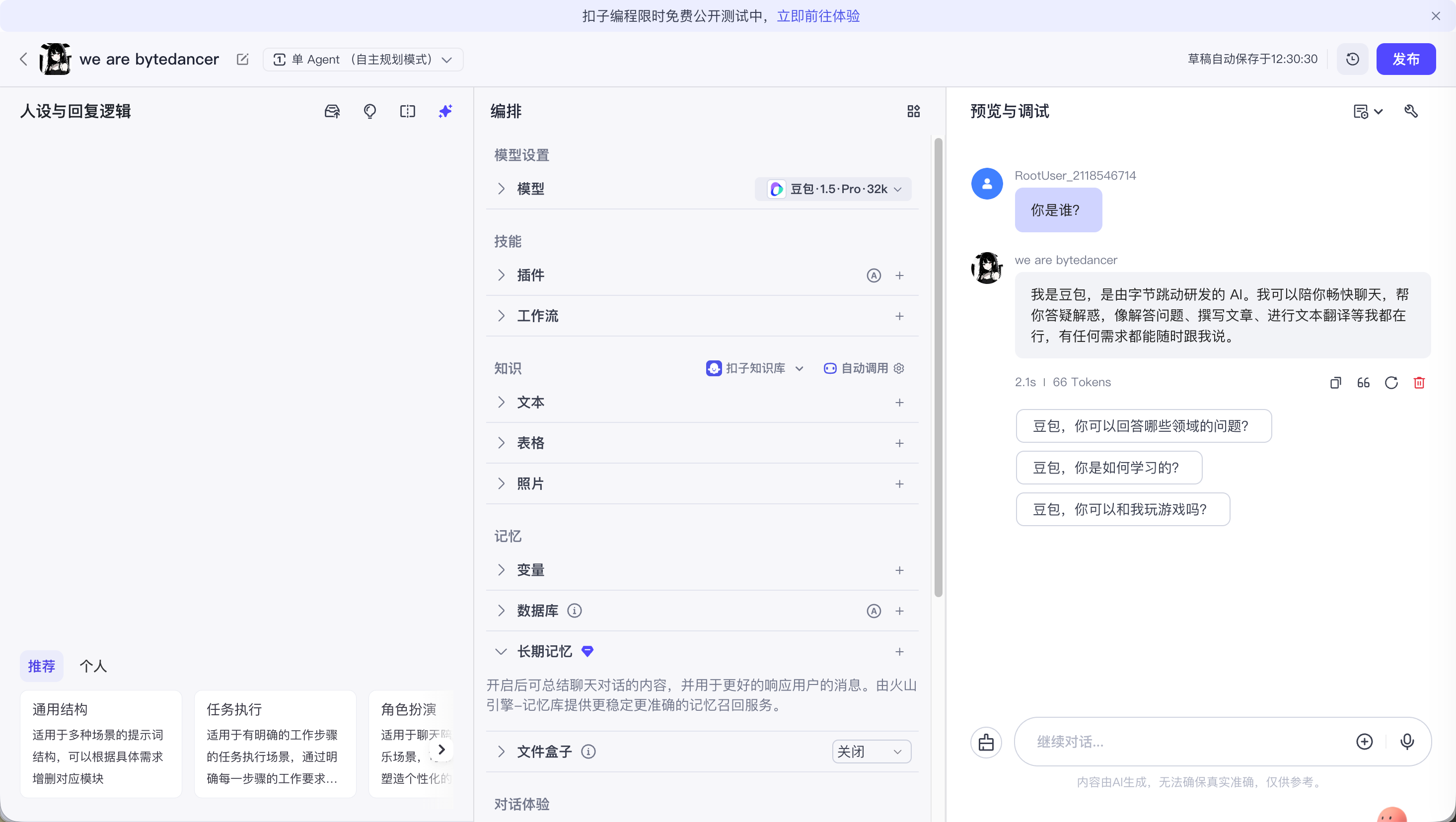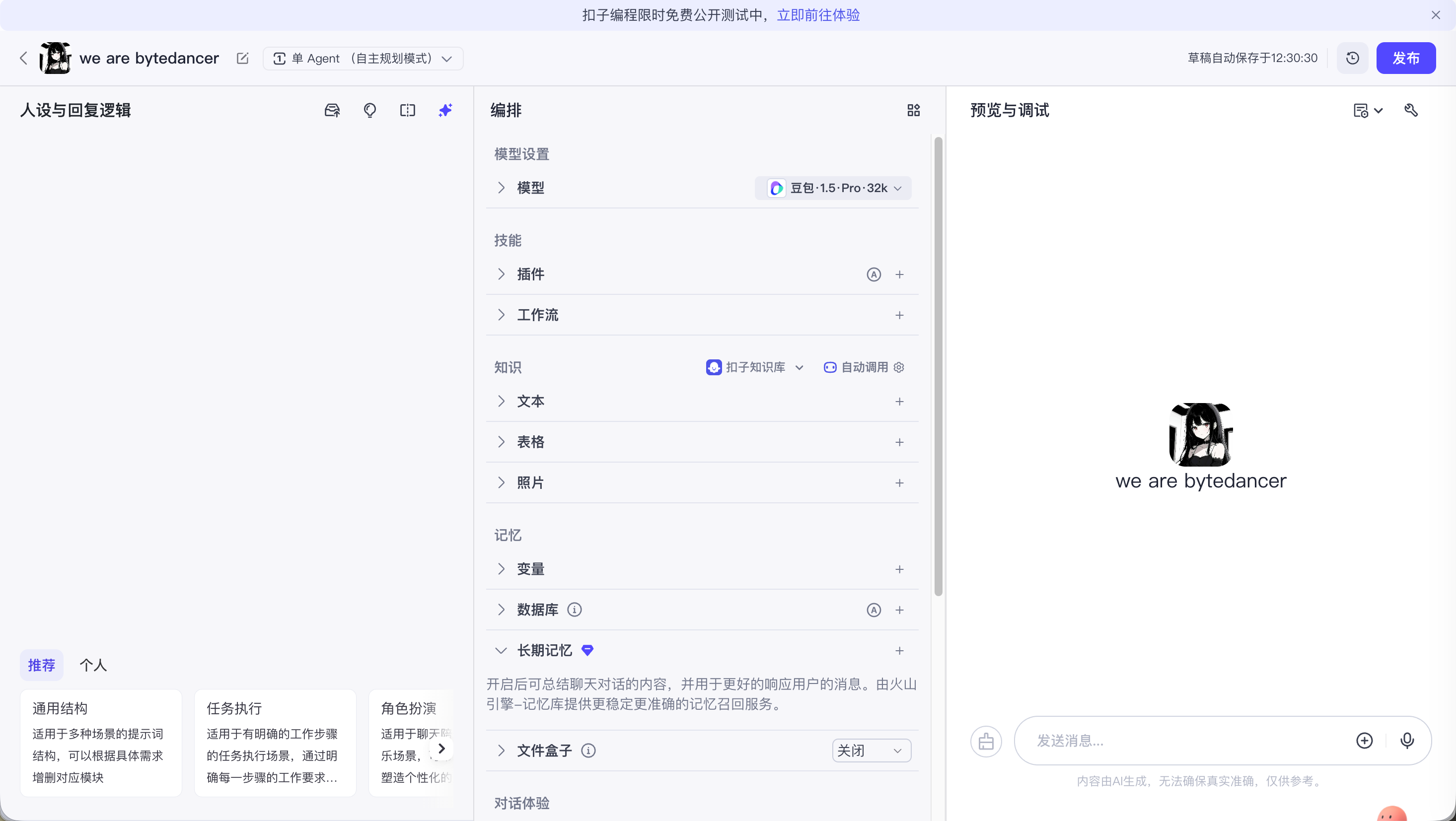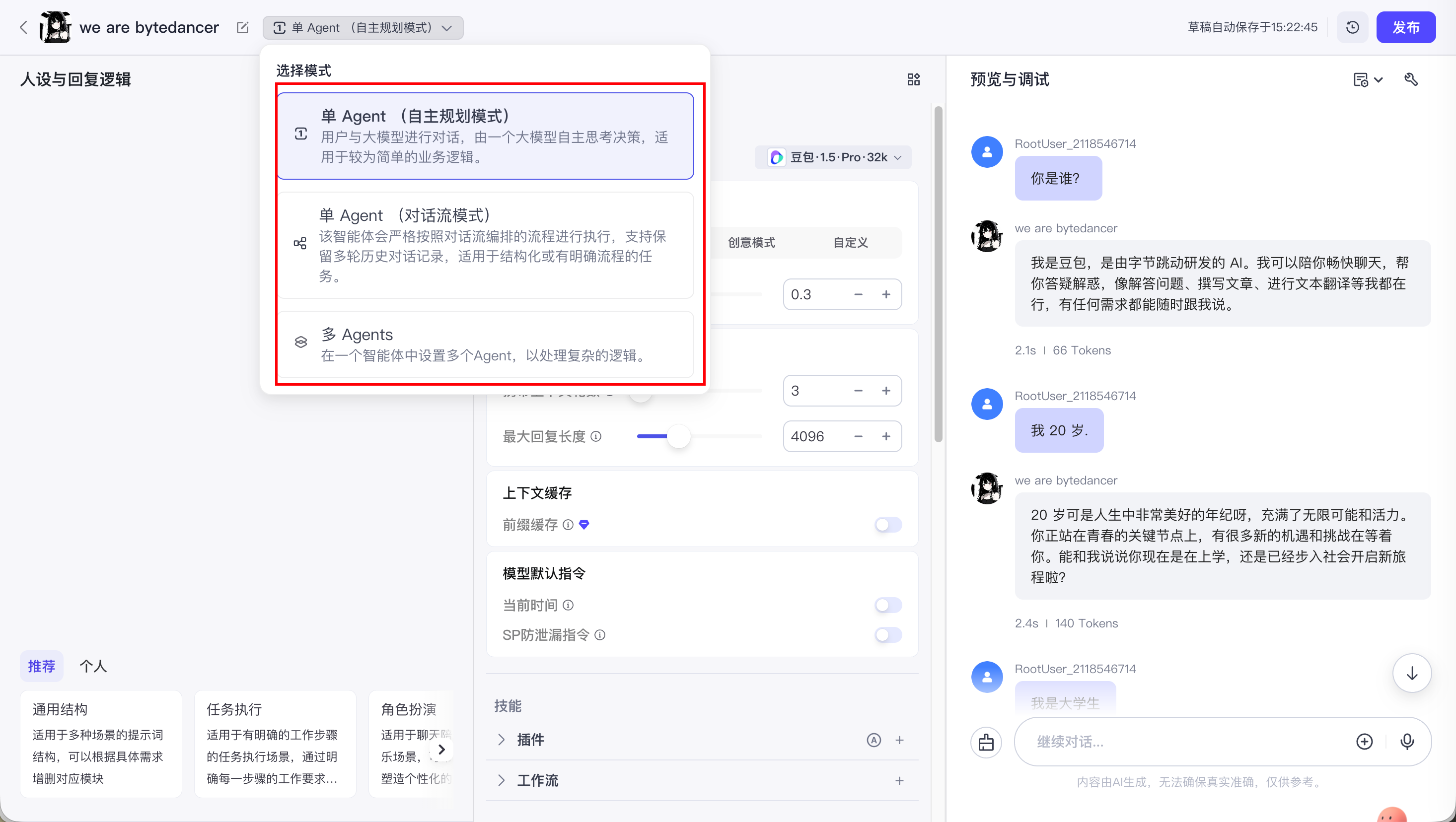 因为我们现在是学习阶段, 智能体的案例场景都比较简单, 因此我的智能体使用的都是: 单 Agent(自主规划模式).