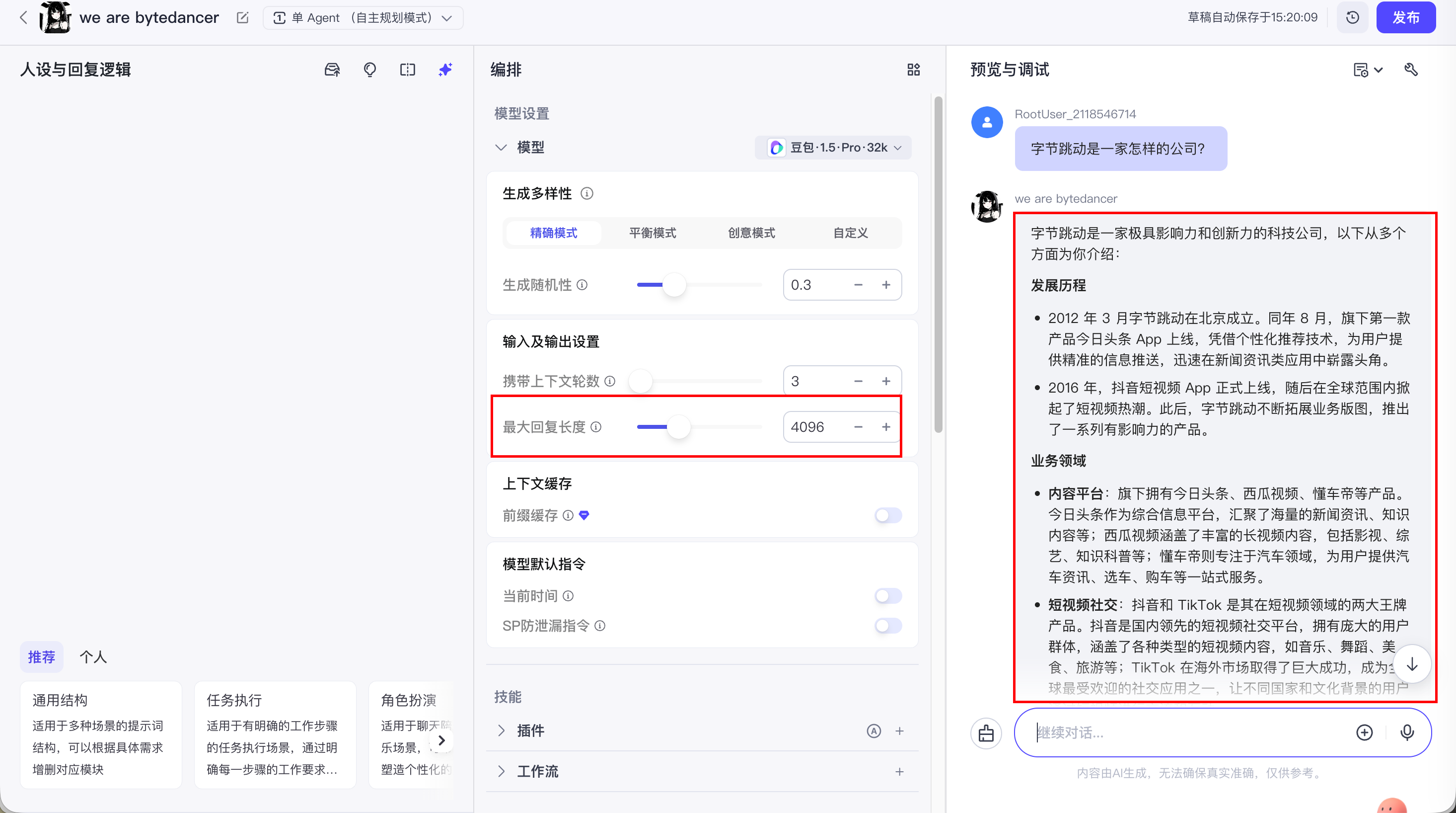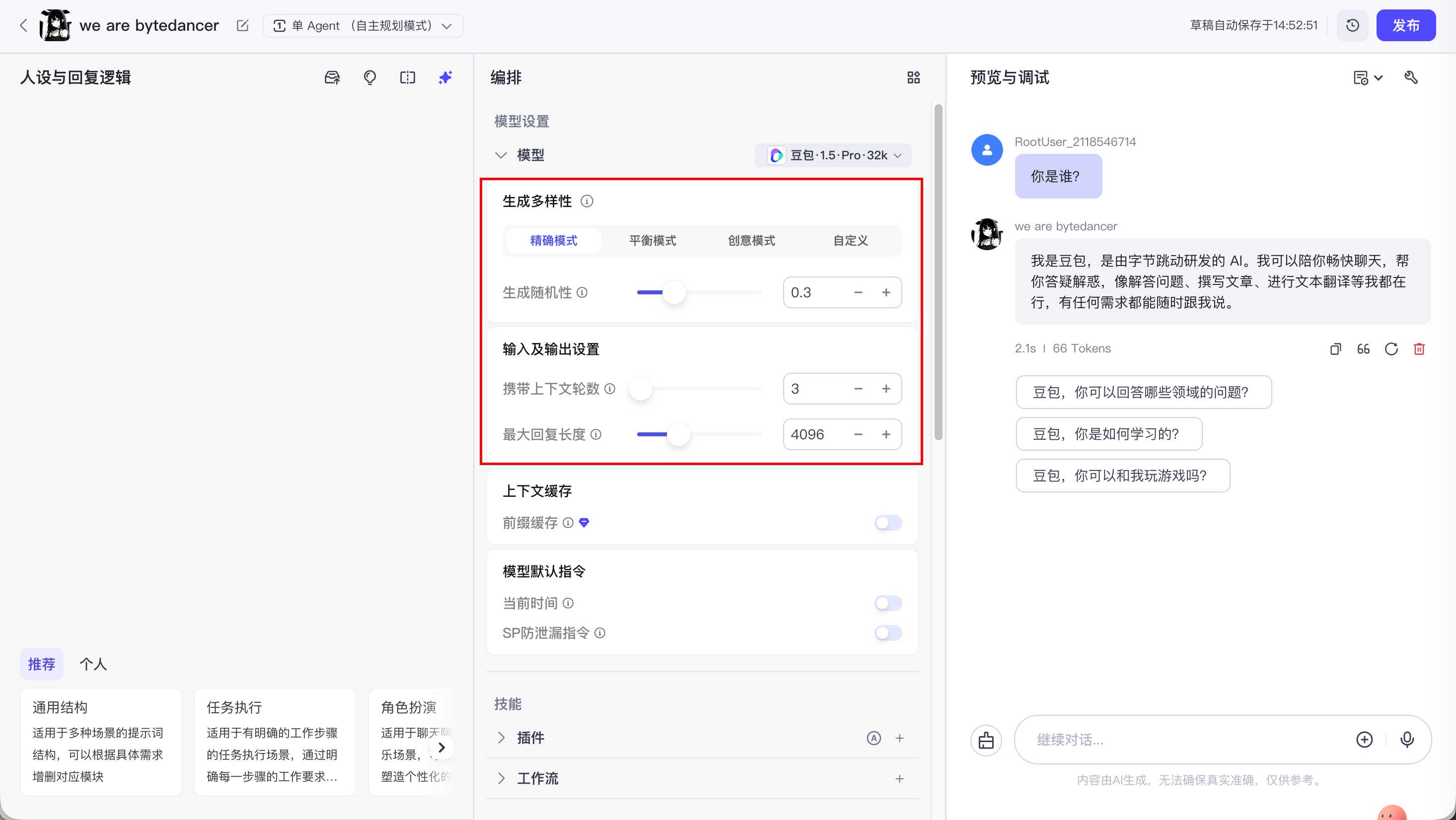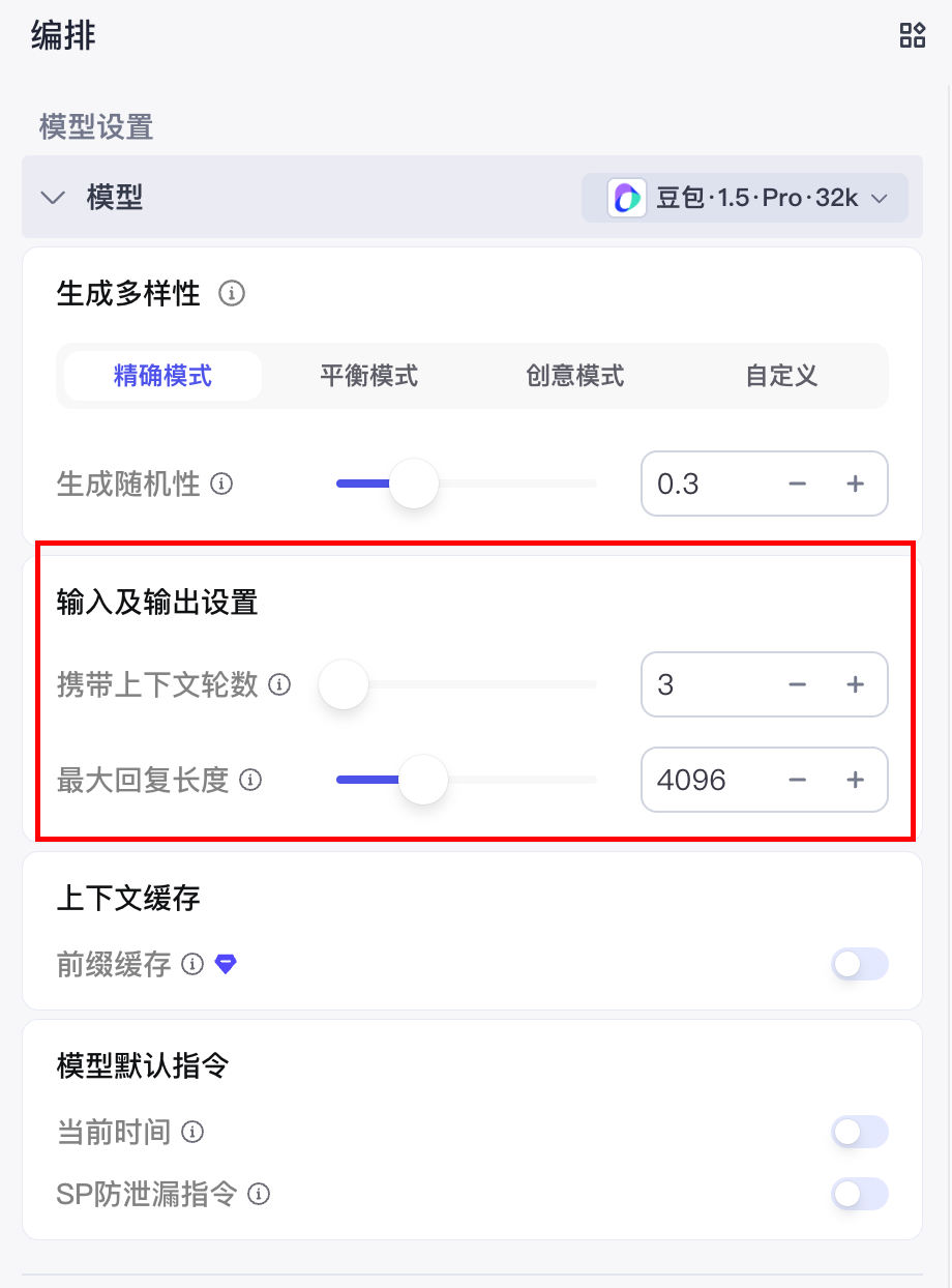 这里推荐设置为 "精确模式-0.3", 因为我们后续也会通过系统提示词去限制模型的输出.
