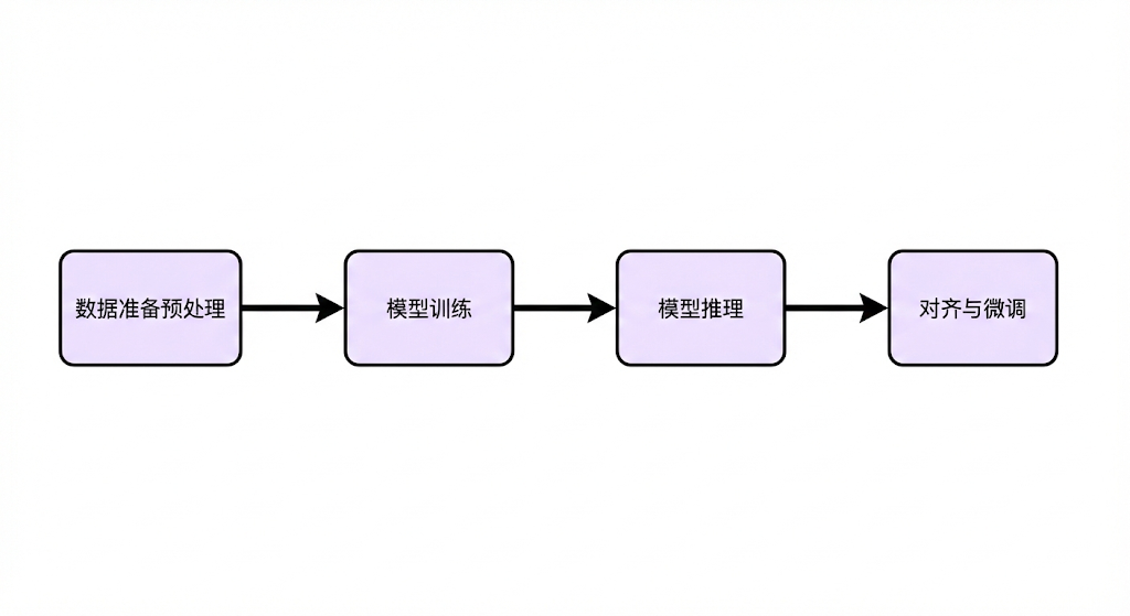 - 模型训练: 学霸按照学习资料去学习. (这是最核⼼、最耗计算资源和时间的⼀步. 其核⼼是⾃监督学习)
