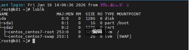 因为本机已经损坏无法登录,无法输入命令lsblk, 换了台虚拟机,两个都一样的配置另一台没有配置docker等的新机器,输入命令确认分区如下