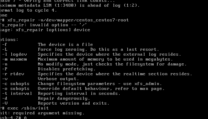 xfs_repair -n /dev/mapper/centos_centos7-root exec /sbin/init