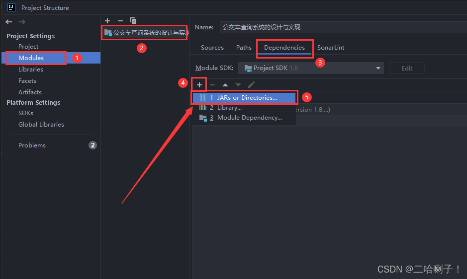 在弹出的页面中选择【Modules】再选择此项目,点击右边的【Dependencies】,再选择下面的小加号,选择【1 JARs or Directories...】或者【2 Library...】