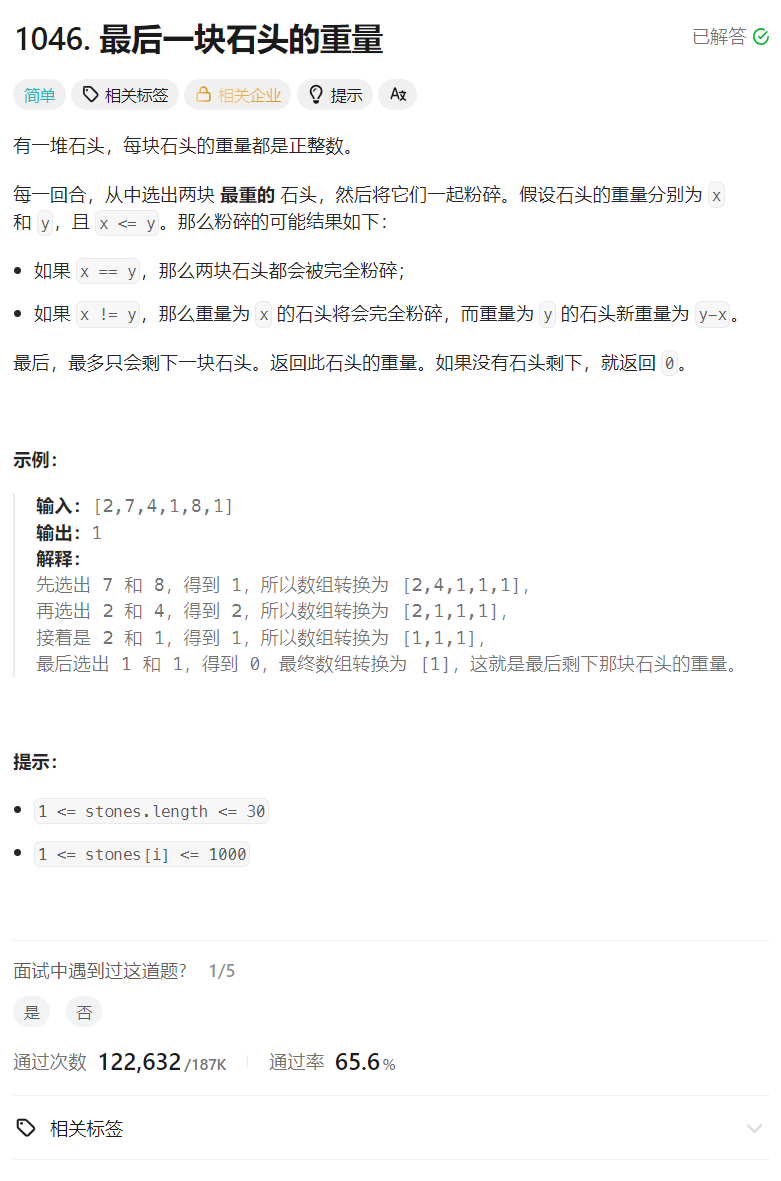 把所有的数据入堆,然后依次拿取堆顶元素,判断这个两个元素是否相等,不相等,大的值减去小的值入堆;当堆只有一个元素或者没有数据时,就结束循环,最终如果这个堆有数据那么这个数据就是最终答案,否则返回 0