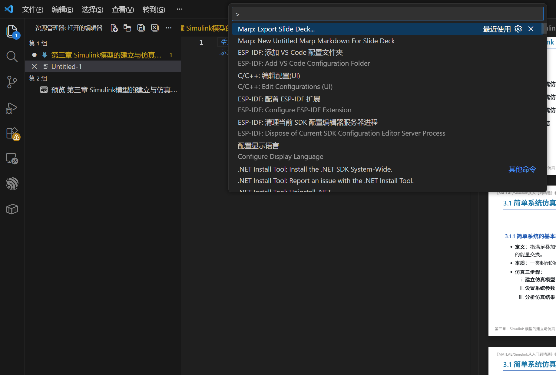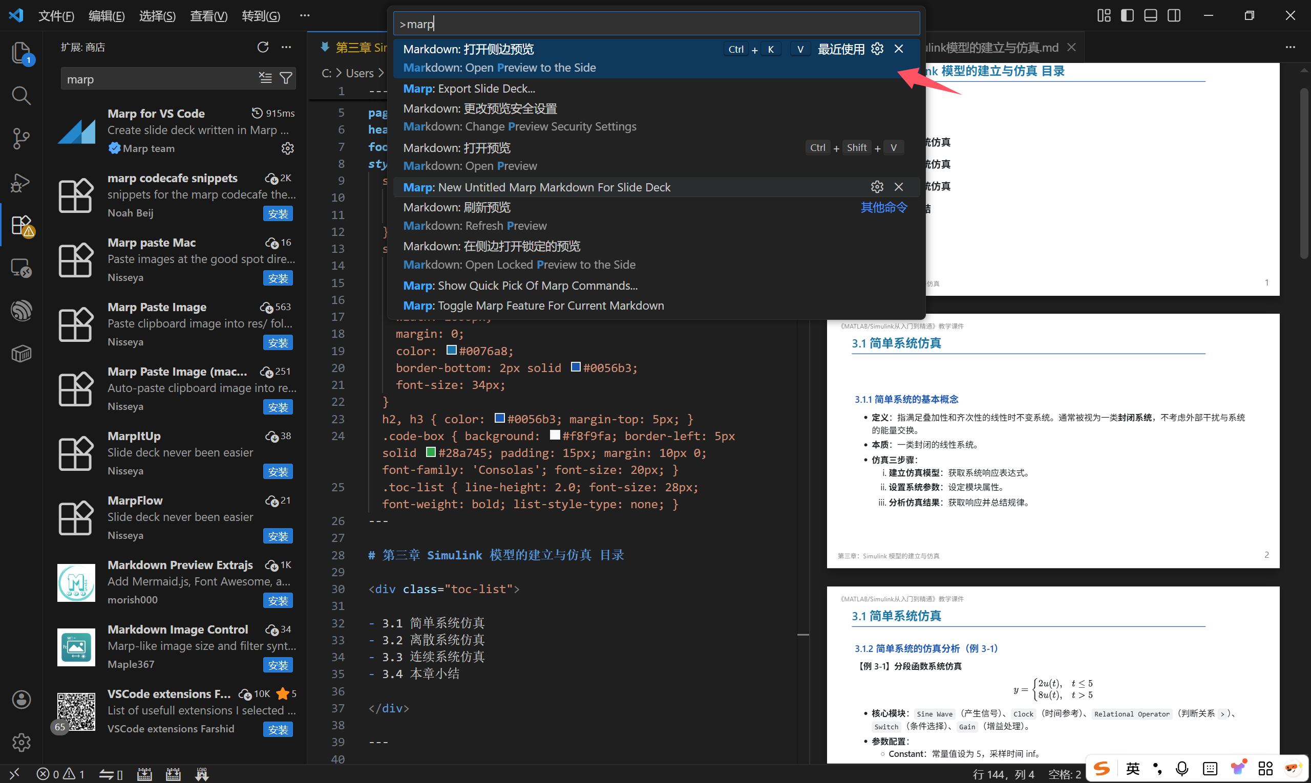 快捷键ctrl+shift+p,输入marp,选中打开侧边预览