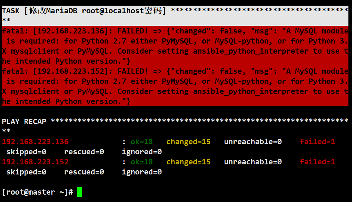 首先,错误原因:Ansible 的 mysql_user/mysql_db 模块依赖 Python 的 MySQL 数据库驱动包,但受控节点上没有安装对应的包,或者 Python 解释器版本不匹配导致找不到驱动。