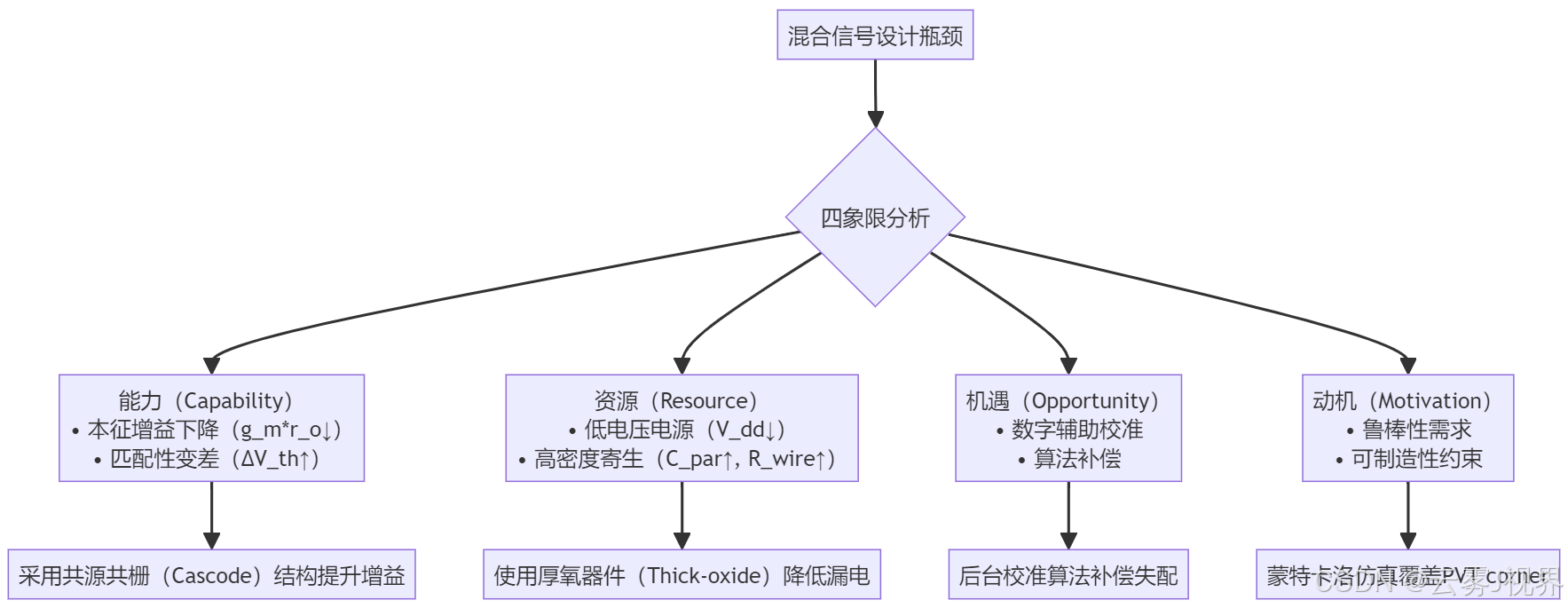 在22nm FD-SOI等先进工艺下,器件非理想效应已成为混合信号设计的主要障碍。Meta团队提出四象限分析法(Four-Quadrant Analysis),系统化诊断并应对这些挑战: