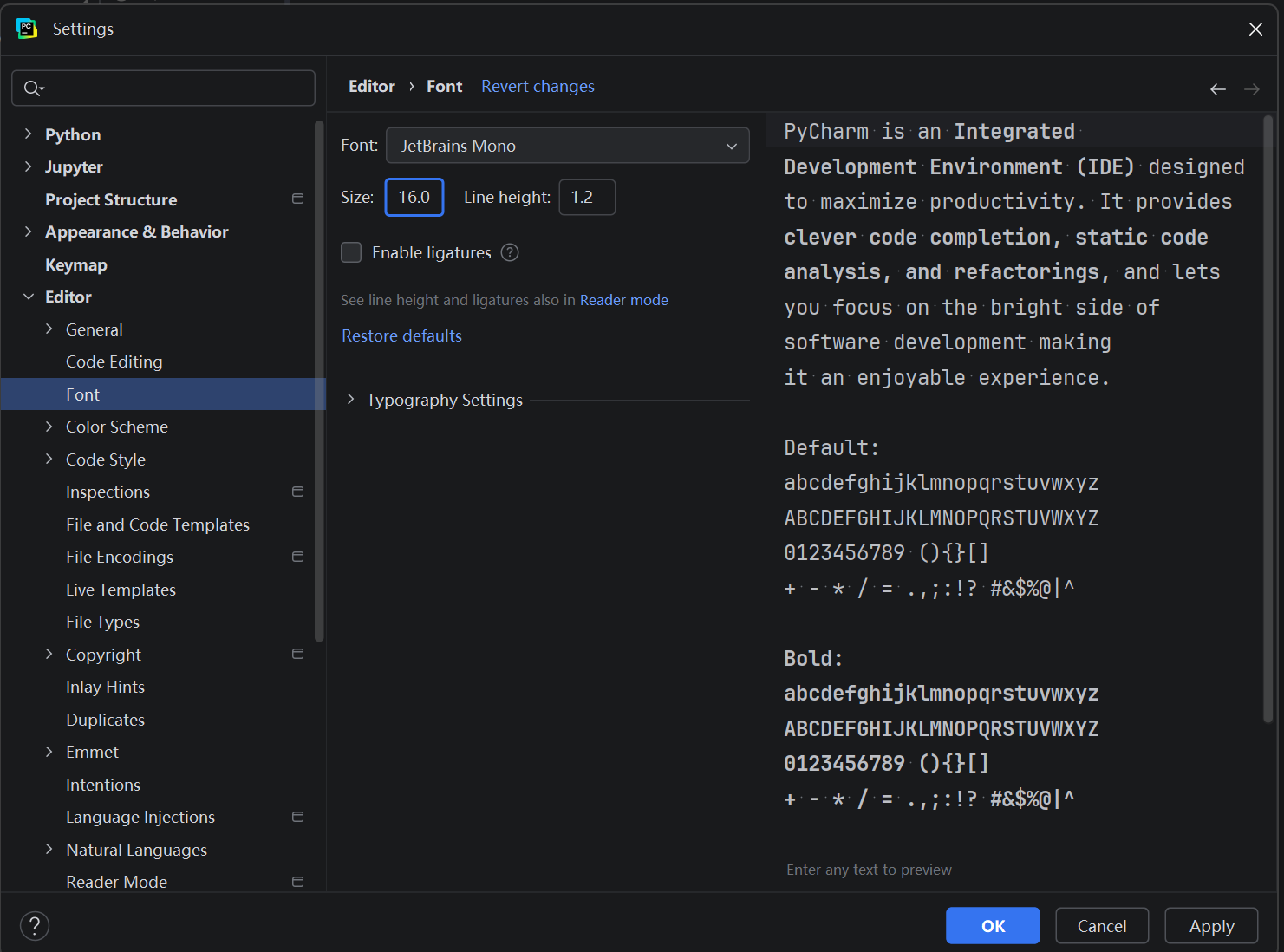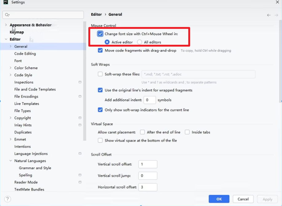 - 启动快捷键: ctrl + 加号/减号 可以调整字体大小