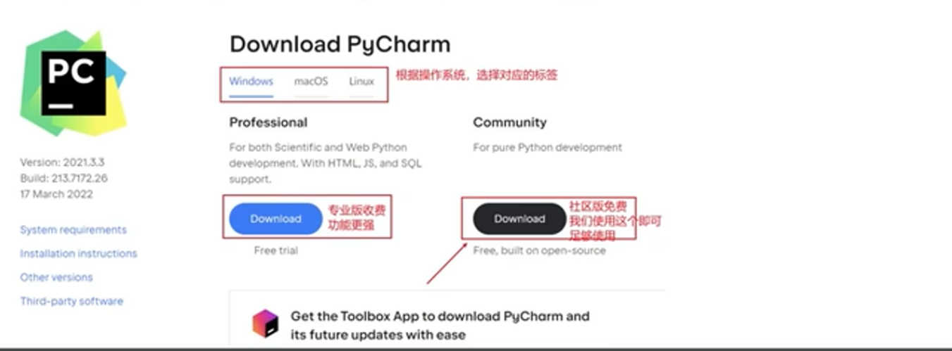 打开网站: https://www.jetbrains.com/pycharm/download/#section=windows