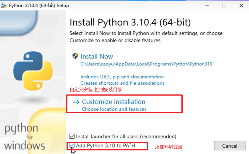这是因为安装python的时候,没有勾选:add python 3.10 to PATH的选项
