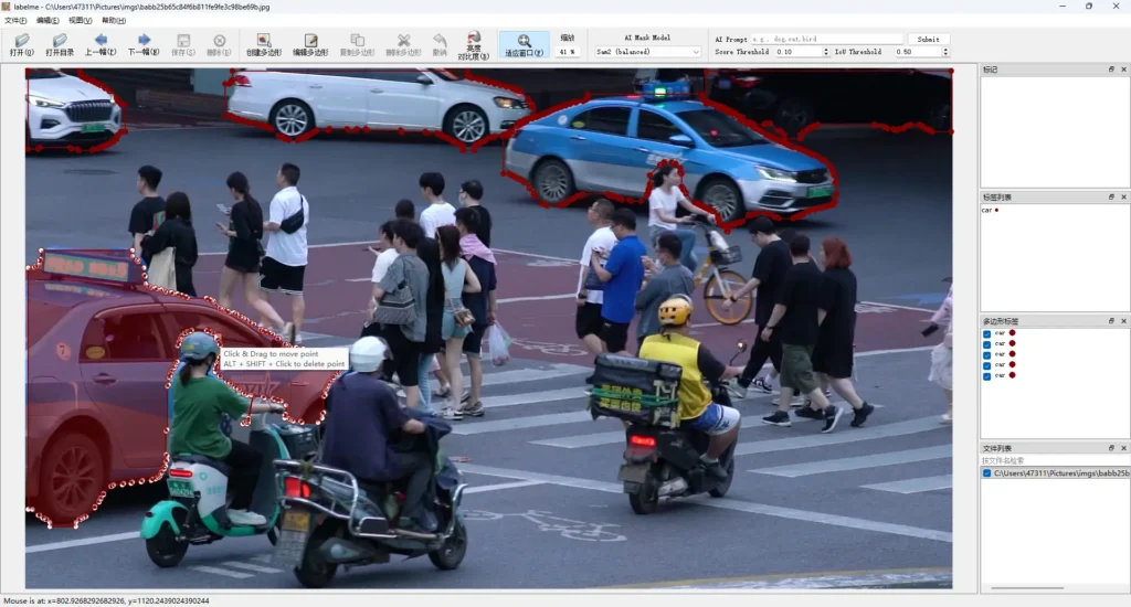 点击"开始自动标注",工具将遍历所有图片,调用模型推理,并将每张图对应的实例分割结果以 JSON 格式保存至指定目录,文件名与原图一致。