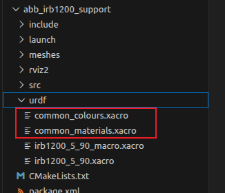 (2)、将abb_ros2-humble\robot_specific_config\abb_irb1200_support\urdf文件夹下的irb1200_5_90.xacro、 irb1200_5_90_macro.xacro 和irb1200.ros2_control.xacro文件拷贝到abb_irb1200_support/urdf文件夹中