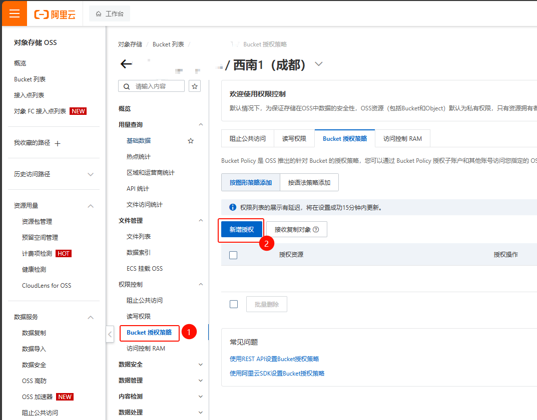 在Bucket的授权策略中,点新增授权。