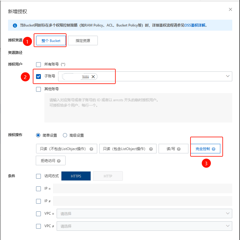 因为以前弄PicGo的时候已经创建过RAM账号了,所以可直接在Bucket中添加子账号的授权就行。