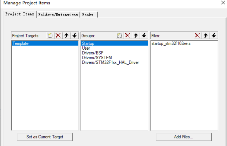 注:STM32F103xE是笔者选择的启动文件的后缀,这里根据自己的情况进行填写。