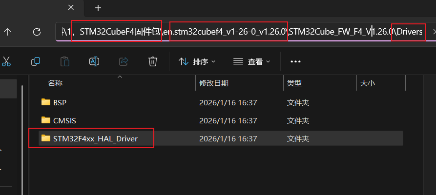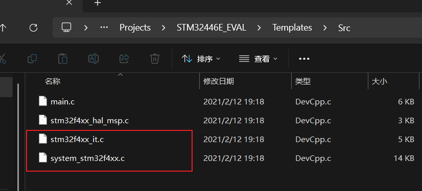 然后再进入解压后的固件包目录STM32CubeF4固件包\en.stm32cubef4_v1-26-0_v1.26.0\STM32Cube_FW_F4_V1.26.0\Projects\STM32446E_EVAL\Templates\Src