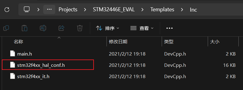 再进入到目录STM32CubeF4固件包\en.stm32cubef4_v1-26-0_v1.26.0\STM32Cube_FW_F4_V1.26.0\Projects\STM32446E_EVAL\Templates\Inc,将下图红框选中的两个文件复制到Users文件夹中: