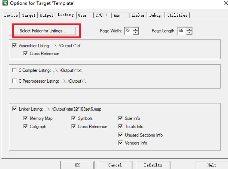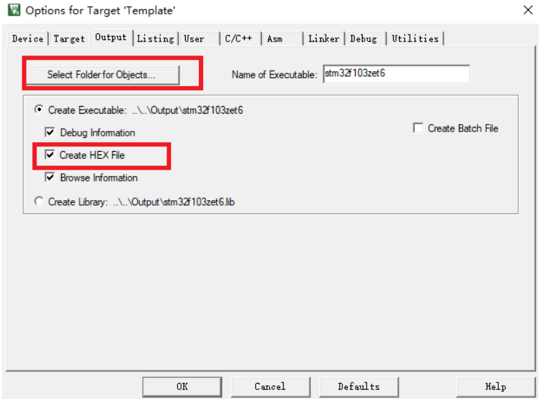 点击"Select Folder for Objects"按钮,选择第三章的3.4节介绍的/Output目录,设置将编译生成的文件存放在该目录。然后勾选Create HEX File。