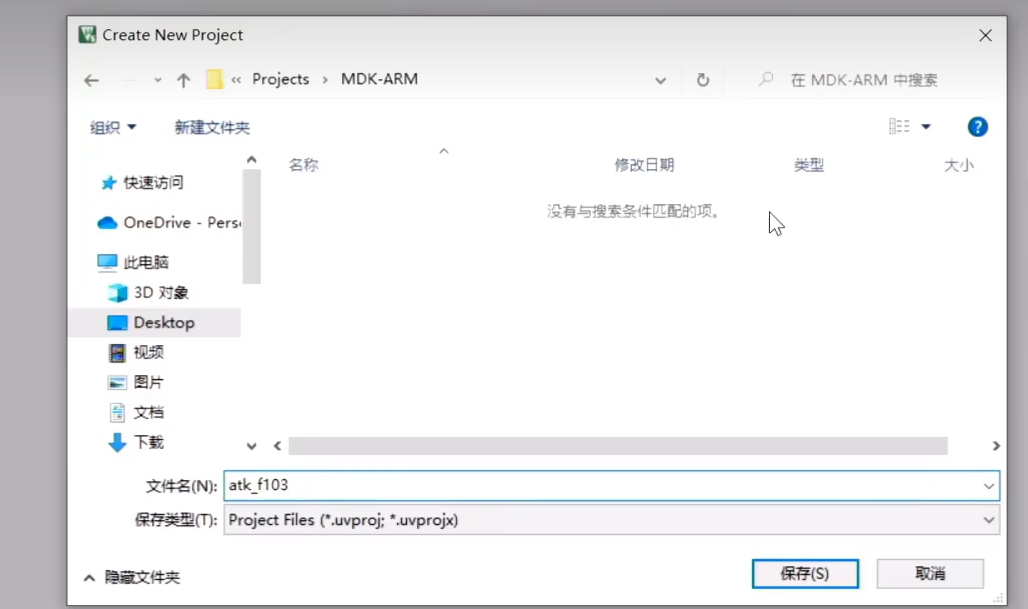 打开Keil5软件,点击菜单栏中Project->New uVision Project,之后填写工程名,习惯使用MCU的型号来作为工程名字,也可以按照个人喜好来命名。工程保存在第三章介绍的Projects/MDK-ARM中即可,如下图所示: