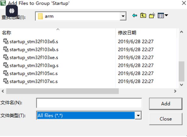 1.在Startup分组中添加启动文件,在\Drivers\CMSIS\Device\ST\STM32F1xx\Source\Templates\arm中。