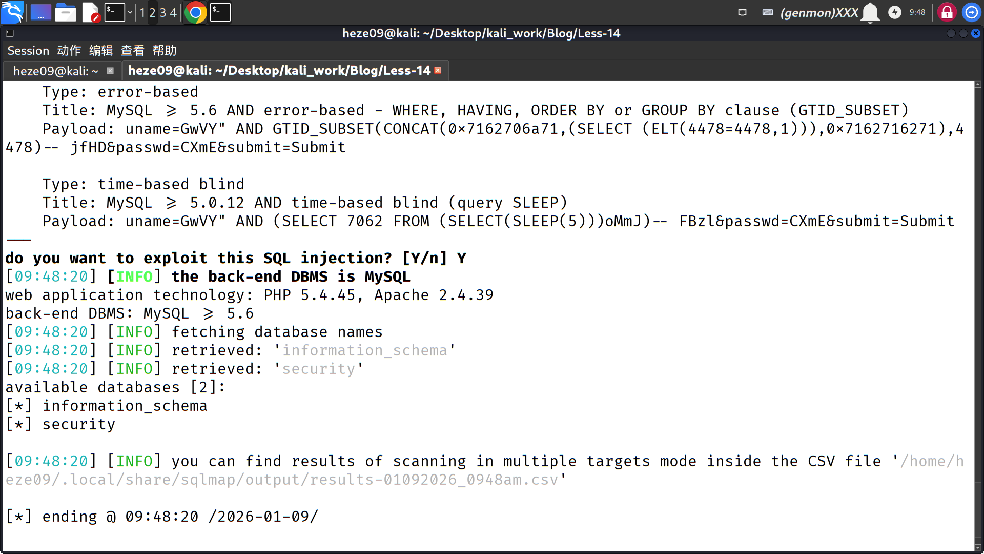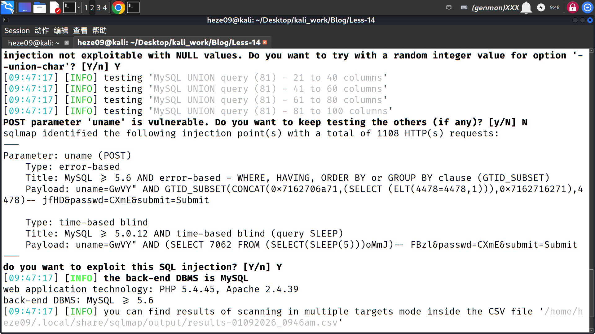 查询结果如图所示:存在注入点uname,注入方式为POST,注入类型分别为:error-based,time-based blind; 并给出了相应的payload。
