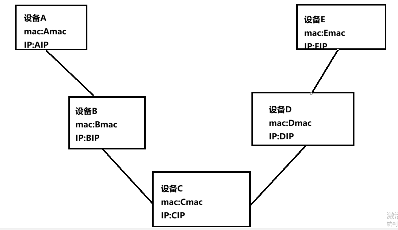 如图所示,我们假设一次信息传输中涉及到五个设备的名称以及地址如上。现在我们想要从A向E发送一个信息。