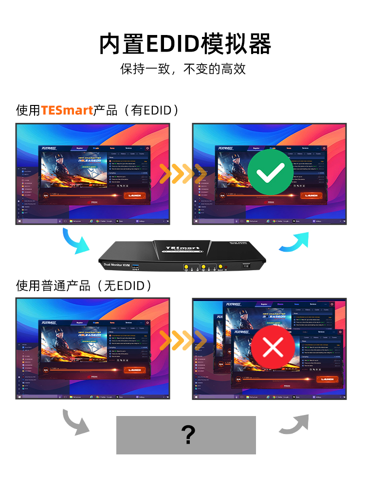TESmart产品系列将EDID技术融入其KVM切换器中,显著提升了其性能和使用便捷性。EDID技术的集成带来了多重益处,其中关键点包括提升了与各种显示器和信号源设备的兼容性,以及提供了针对特定用户需求定制的选项。