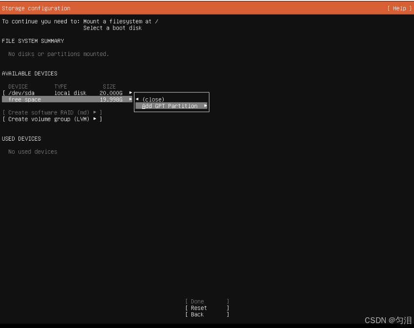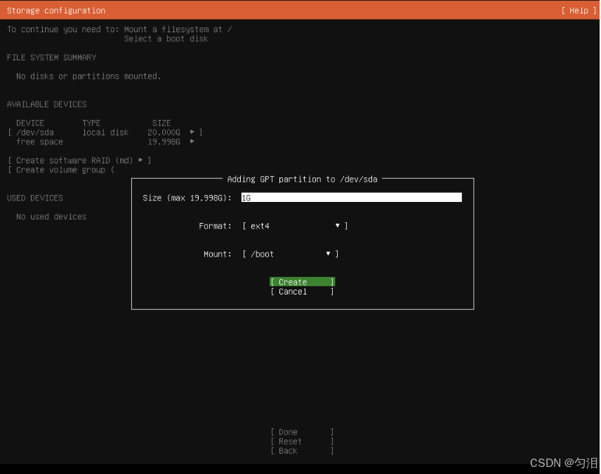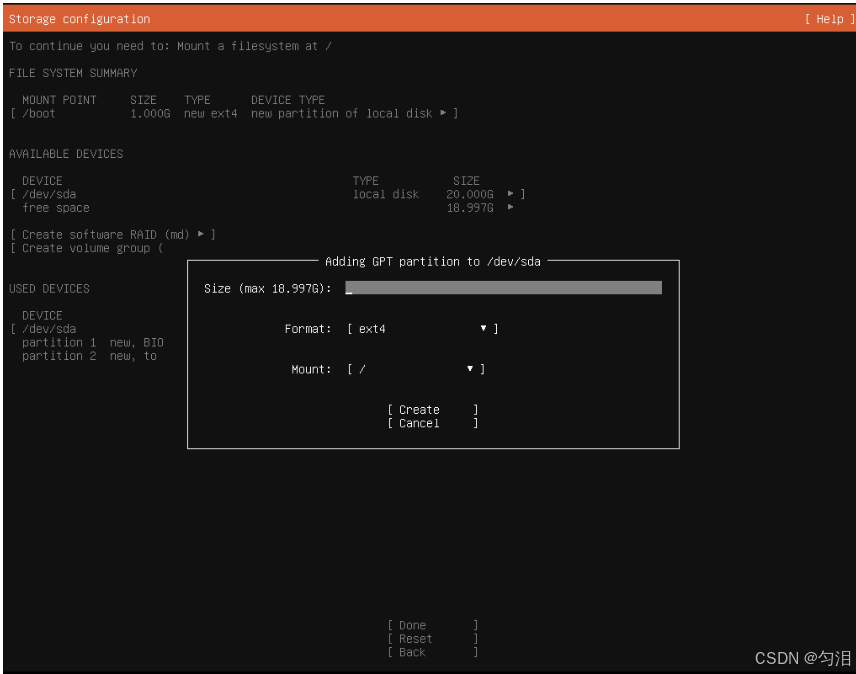 /(根分区):- 点击 "Add",分区类型选择 "Primary",大小默认使用剩余全部空间,挂载点选择 "/",文件系统选择 "ext4",点击 "Create";