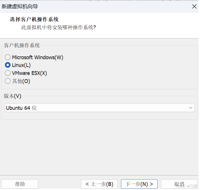 - 客户机操作系统选择 "Linux",版本选择 "Ubuntu 64 位",点击 "下一步";