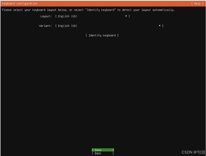 - 选择 "Keyboard layout",默认 "English (US)",按回车;