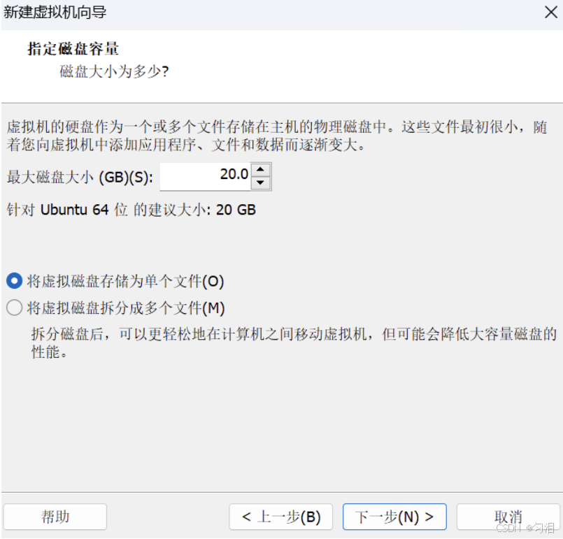 - 磁盘大小设置为 "20GB"(生产环境建议≥40GB),选择 "将虚拟磁盘存储为单个文件",点击 "下一步";