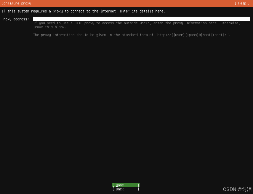 http://proxy.example.com:8080),否则留空; - 选择 "Done",按回车。