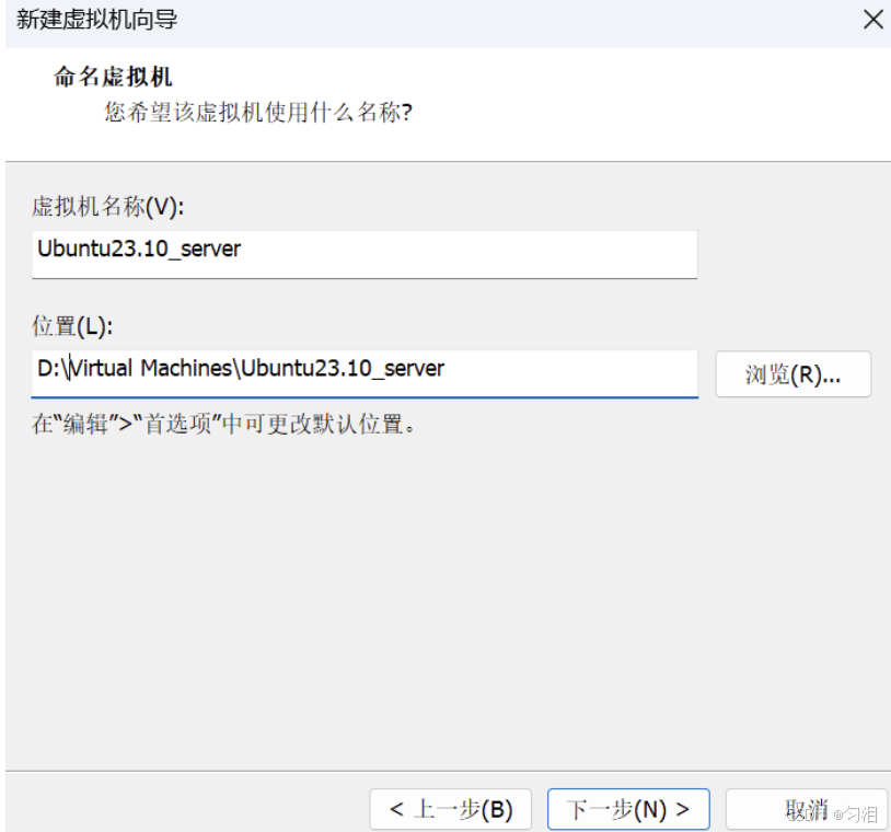 - 虚拟机名称输入 "Ubuntu Server 22.04",选择存储位置(建议放在 SSD 分区),点击 "下一步";