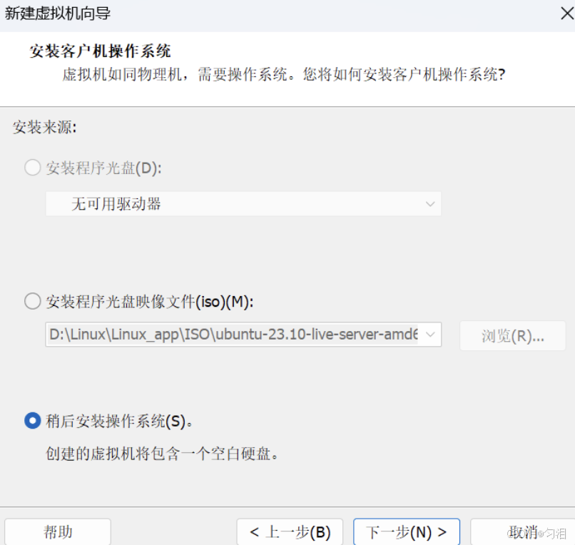 - 选择 "安装程序光盘映像文件(ISO)",点击 "浏览" 选择下载好的 Ubuntu Server ISO 文件,点击 "下一步";