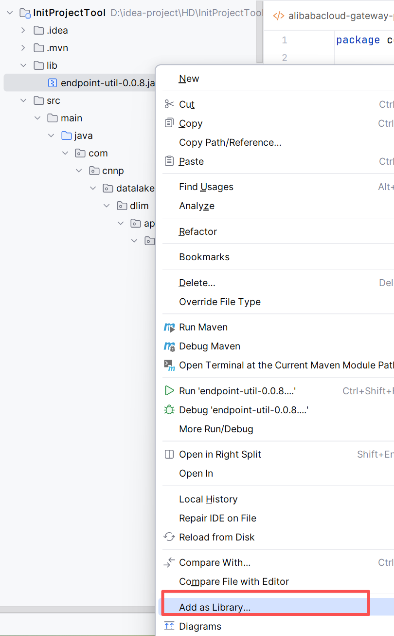 配置 在所使用jar项目的根目录创建与 src 同级别的 lib 文件夹 将上面打包的jar放入;然后重要的一步 选中我们lib中的jar 右键 add as libray; (保证本地运行的时候可以找到相关jar信息)