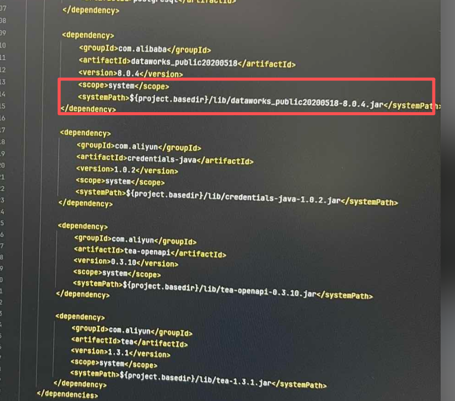 然后相对应的在pom中引入这些外部jar 所在位置如下配置 主要就是定义 scope 和这些外部jar所在位置 systemPath